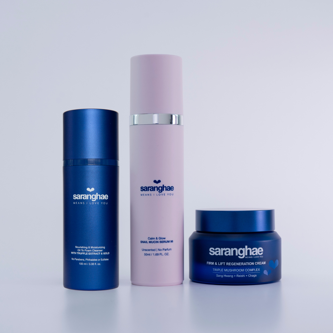 The Saranghae Meyong Jo Trio is a meticulously crafted 3-step skincare ritual designed to cleanse, restore, and rejuvenate your skin. Featuring our Nourishing & Moisturizing Oil to Foam Cleanser, Calm & Glow Snail Mucin Serum, and Firm & Lift Regeneration Cream, this trio works in harmony to reveal a complexion that is hydrated, calm, and visibly firmer.